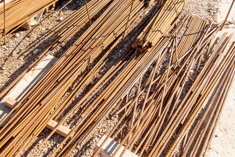 Металлическая арматура лежит на строительной площадке, постройте здание с арматурой