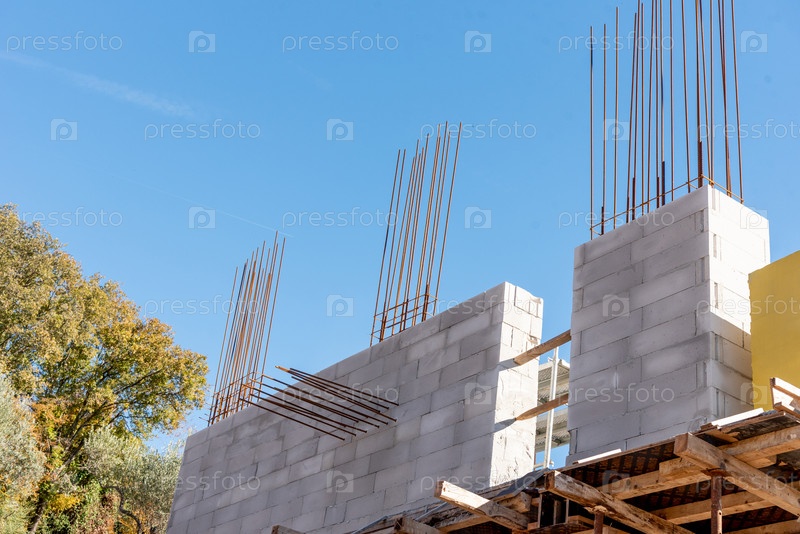 Открытая строительная площадка, строительство жилого дома, металлическая арматура и бетонные конструкции