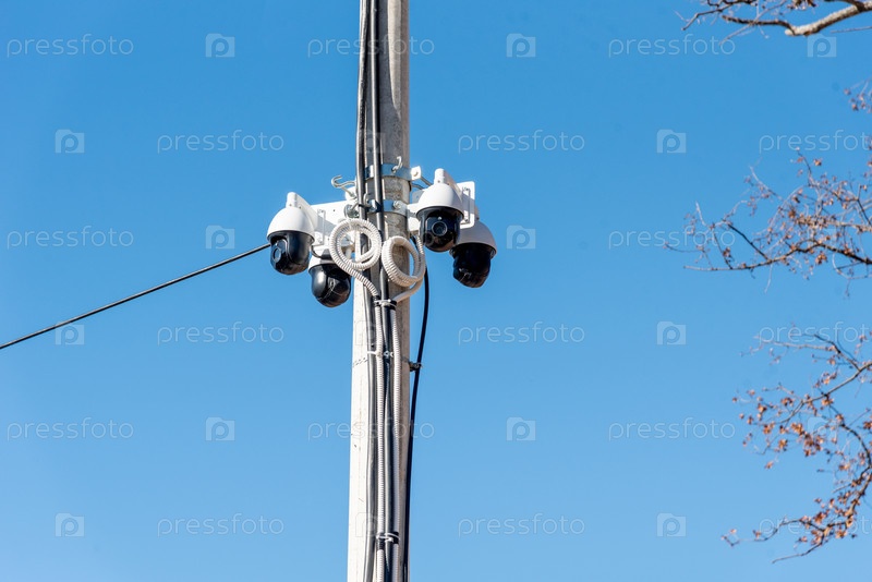На внешней стороне столба установлено множество камер видеонаблюдения, обеспечивающих безопасность и защиту имущества