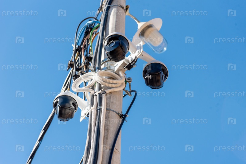 На внешней стороне столба установлено множество камер видеонаблюдения, обеспечивающих безопасность и защиту имущества