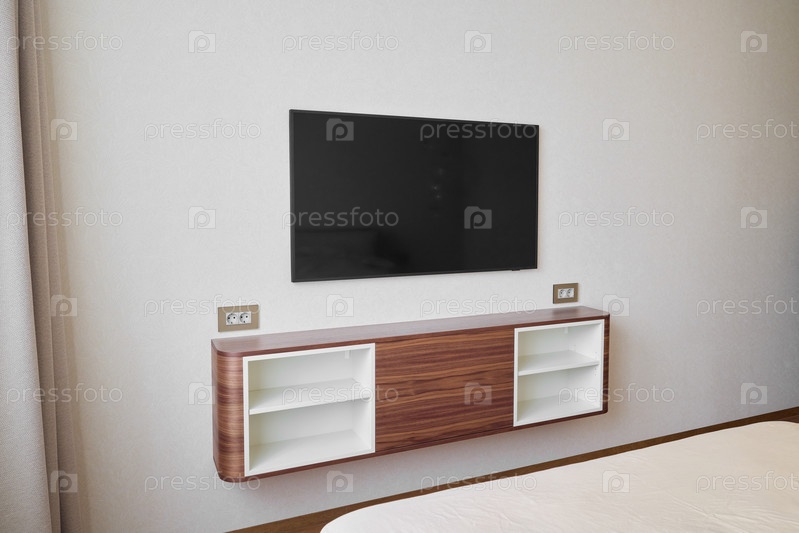 Современная настенная тумба под телевизор в стильно оформленном и эстетичном помещении