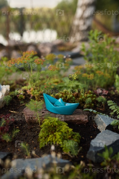 Миниатюрная лодка, расположенная посреди пышного и яркого садового ландшафта, наполненного красочной листвой