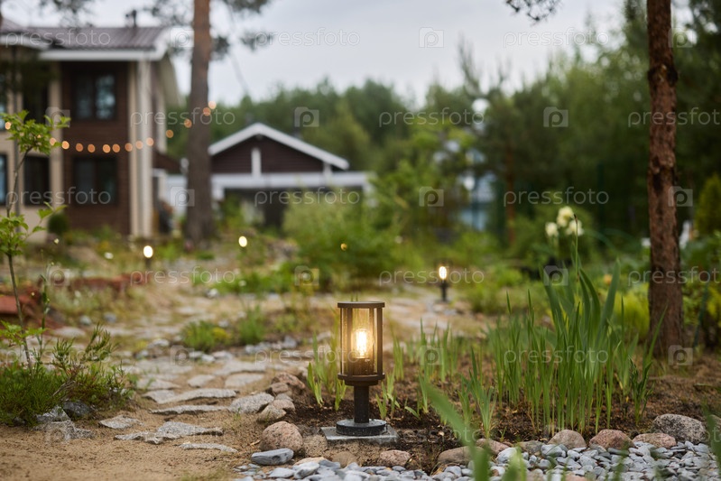 Очаровательная садовая дорожка, украшенная фонарями в сумерках, создающими уютную атмосферу
