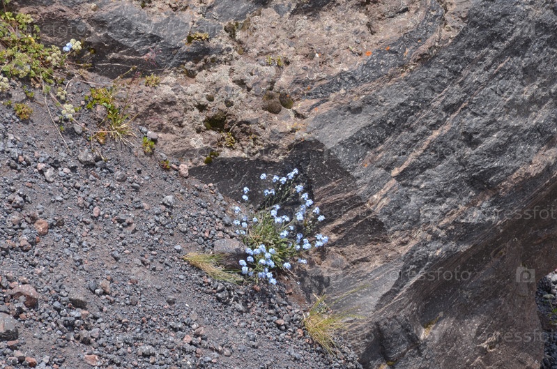 Незабудка альпийская (лат. Myosotis alpestris) среди камней на горе Эльбрус, Кабардино-Балкария