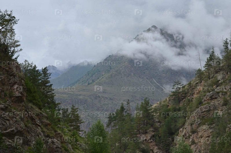 Вид на горы Приэльбрусья в облаках в Баксанском ущелье, Кабардино-Балкария
