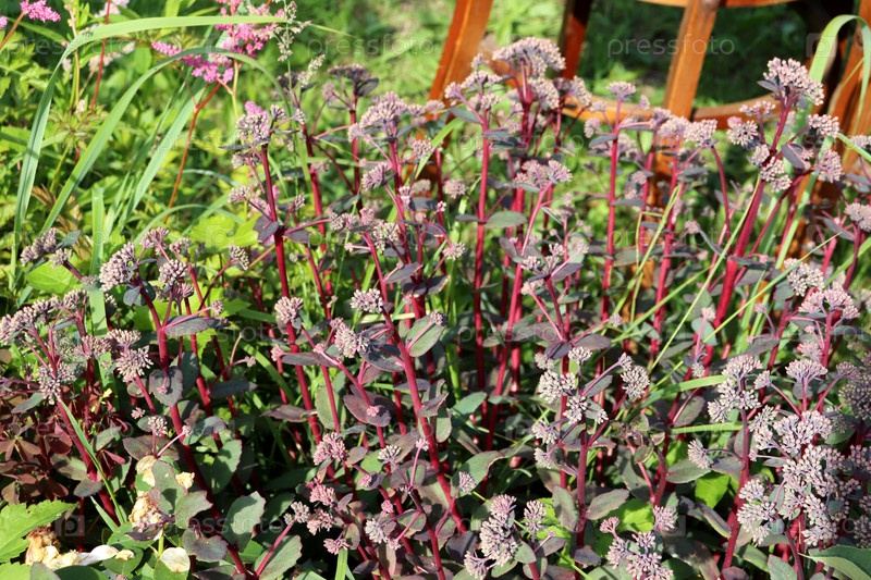 Куст седума гибридного на клумбе в саду в солнечный день
