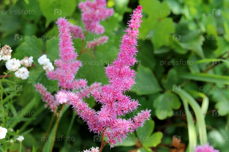 Соцветия розовой астильбы китайской на клумбе в саду в тени