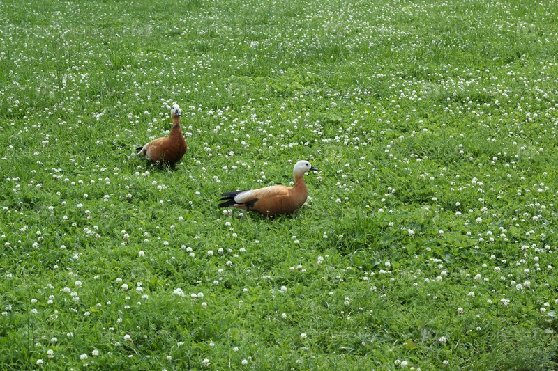 Утки грациозно пасутся на красивом сочном зеленом поле в тихой сельской местности