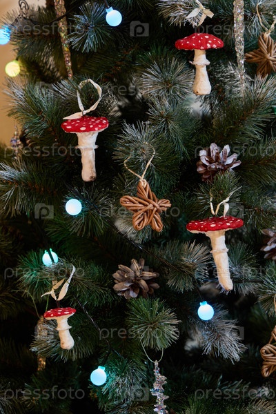 Красиво украшенная рождественская елка, украшенная игрушками ручной работы
