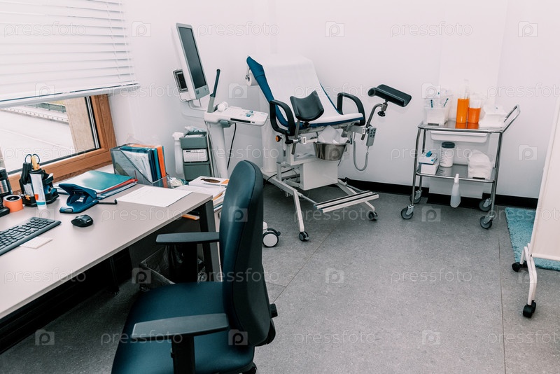 Интерьер кабинета гинеколога в больнице, светлая комната с медицинским оборудованием