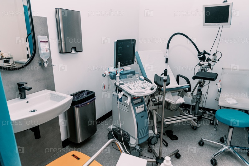 Интерьер кабинета гинеколога в больнице, светлая комната с медицинским оборудованием