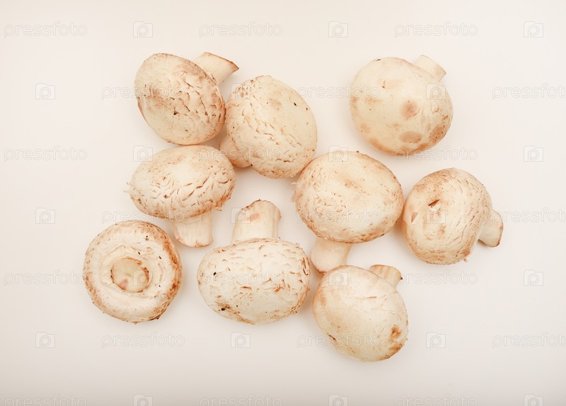 Свежие шампиньоны на белой тарелке. Грибы на белом фоне