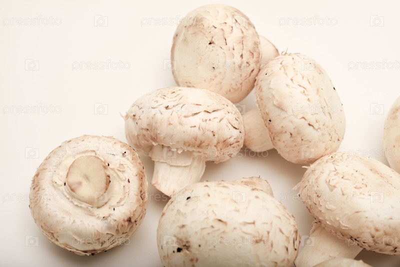 Свежие шампиньоны на белой тарелке. Грибы на белом фоне