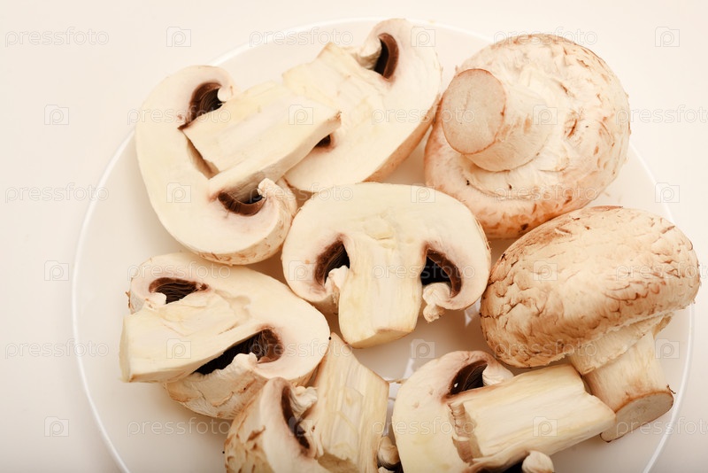 Свежие шампиньоны на белой тарелке. Грибы на белом фоне