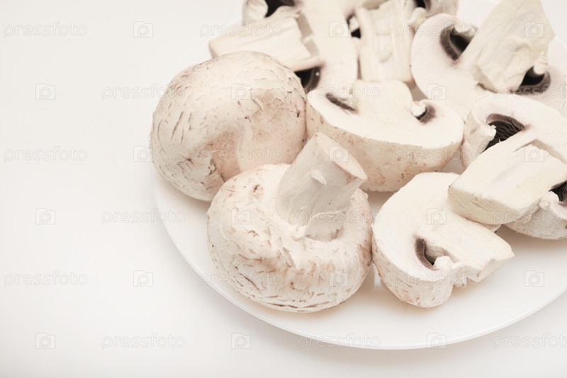 Свежие шампиньоны на белой тарелке. Грибы на белом фоне