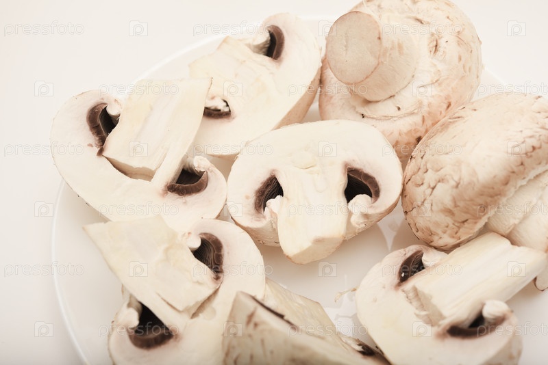 Свежие шампиньоны на белой тарелке. Грибы на белом фоне