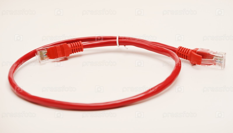 Красный интернет-кабель на белом фоне. разъем RJ-45