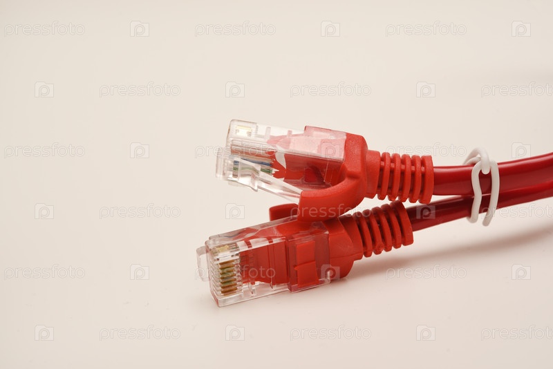 Красный интернет-кабель на белом фоне. разъем RJ-45