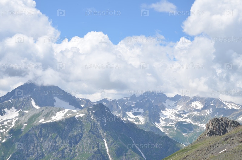 Вид на Главный Кавказский Хребет со смотровой площадки горы Мусса-Ачитара, заснеженные вершины, Домбай, Россия, Карачаево-Черкесская Республика