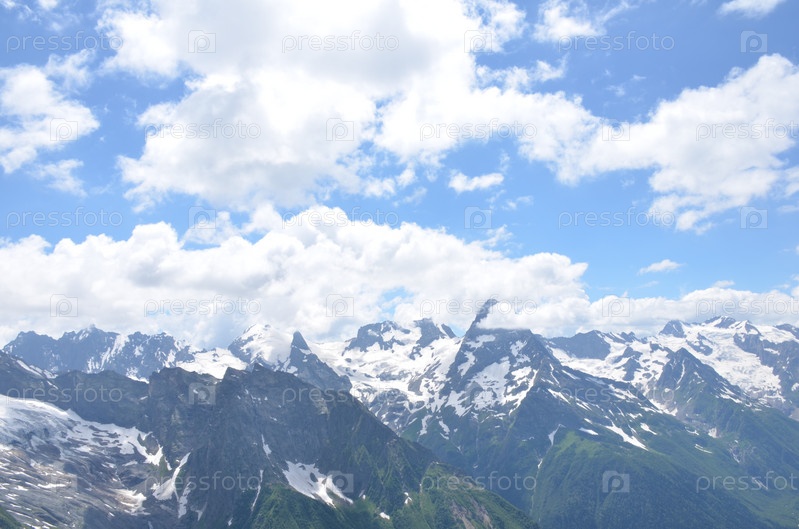 Вид на Главный Кавказский Хребет со смотровой площадки горы Мусса-Ачитара, заснеженные вершины, Домбай, Россия, Карачаево-Черкесская Республика
