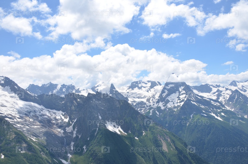 Вид на Главный Кавказский Хребет со смотровой площадки горы Мусса-Ачитара, заснеженные вершины, Домбай, Россия, Карачаево-Черкесская Республика