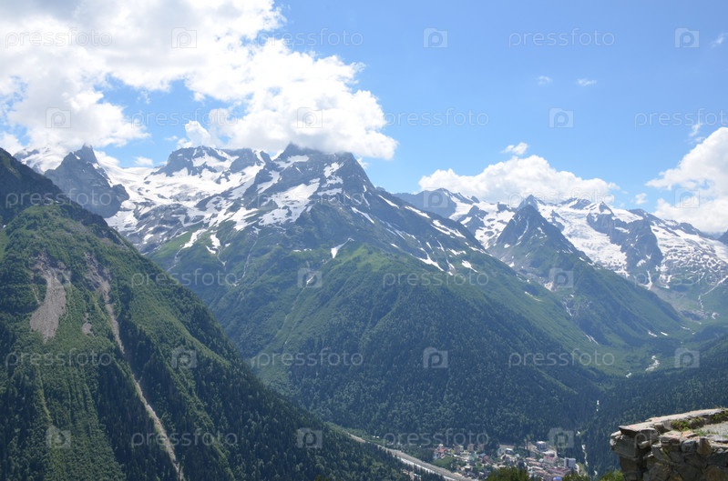 Вид на Главный Кавказский Хребет и поселок Домбай со смотровой площадки горы Мусса-Ачитара, заснеженные вершины, Домбай, Россия, Карачаево-Черкесская Республика