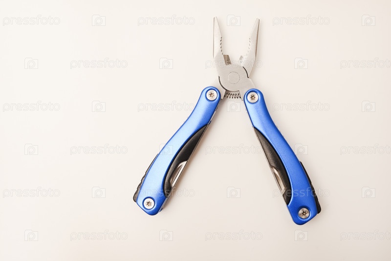 Мультитул на белом фоне. Карманный мультитул. Пила, нож и плоскогубцы