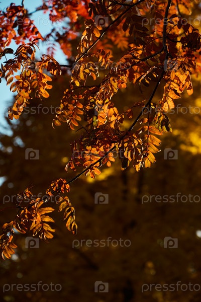 Яркие и красочные осенние листья на фоне ясного и ярко-голубого неба