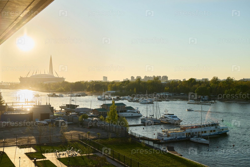 Спокойный и живописный закат над рекой с лодками на фоне прекрасного городского горизонта