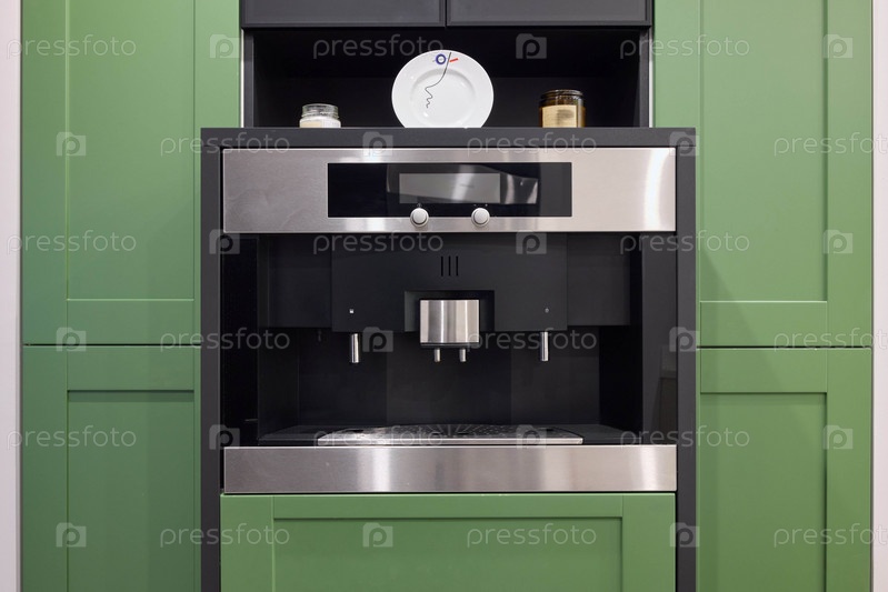 Современная встроенная кофемашина, расположенная в стильной зеленой кухне