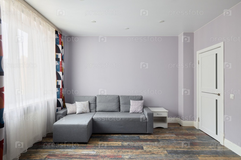 Откройте для себя современную гостиную со стильным серым диваном и большими светлыми окнами