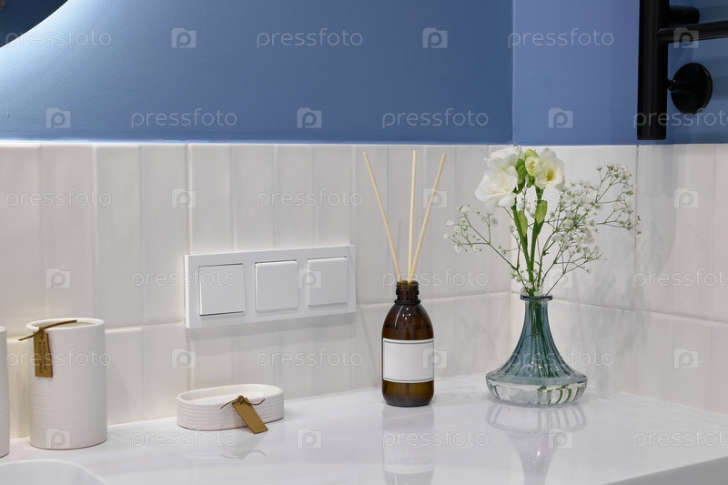 Элегантная столешница для ванной комнаты, украшенная элементами декора, которые вызывают ощущение безмятежности и спокойствия