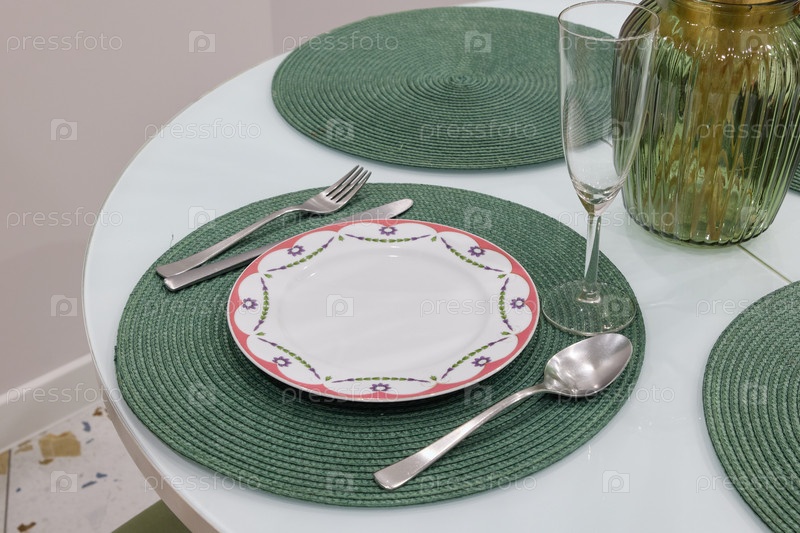 Элегантная и стильная сервировка обеденного стола с красивой декоративной тарелкой и стеклянной посудой
