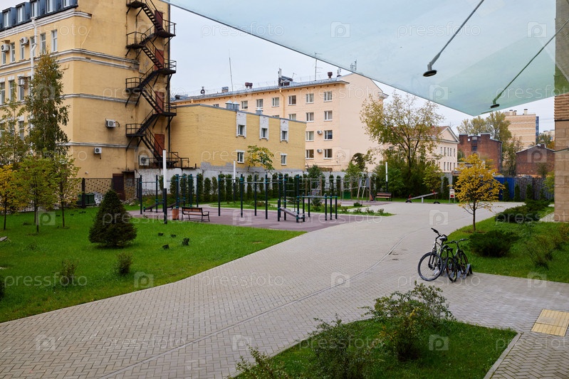 Городской парк с игровой площадкой для детей и достаточным количеством парковок для велосипедов