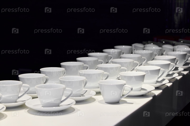 Множество элегантных белых кофейных чашек, красиво расставленных на виду для всеобщего удовольствия