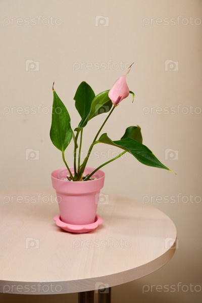 Элегантный розовый цветочный горшок с насыщенными зелеными листьями, красиво размещенный на столе