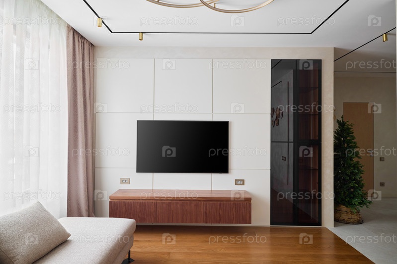Современный интерьер гостиной с телевизором и современным стилем дизайна и эстетикой