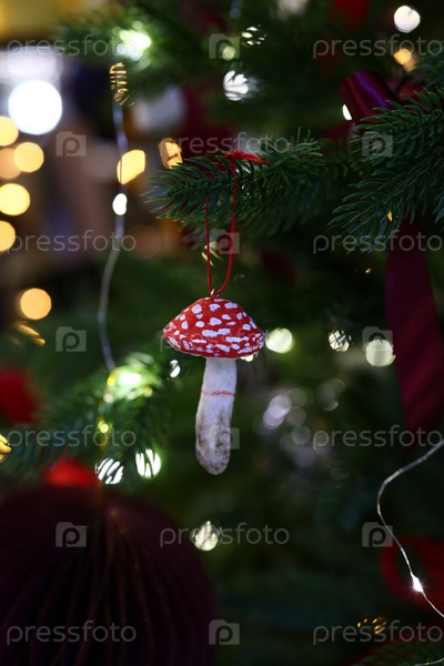 Очаровательное украшение в виде красного гриба изящно висит на красивой рождественской елке