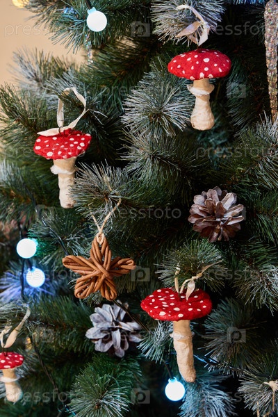 Очаровательные украшения на елку с красными грибочками для создания праздничной атмосферы