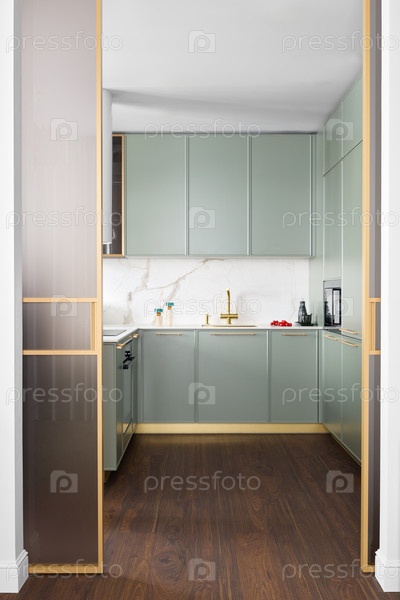 Откройте для себя современный дизайн кухни с красивыми зелеными шкафами и элегантными золотыми акцентами