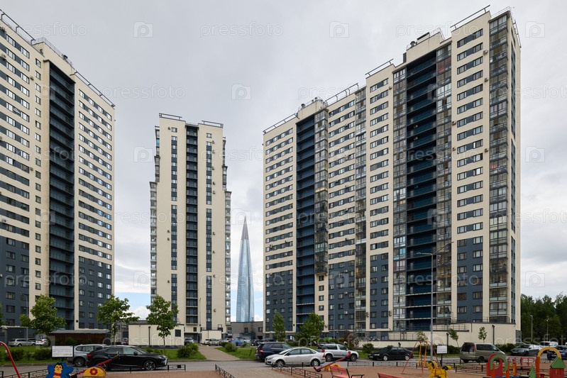 Современный жилой комплекс с величественным небоскребом на заднем плане