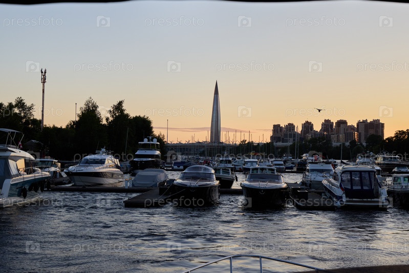 Лодки пришвартованы на закате на фоне потрясающего городского пейзажа. Прекрасный вид