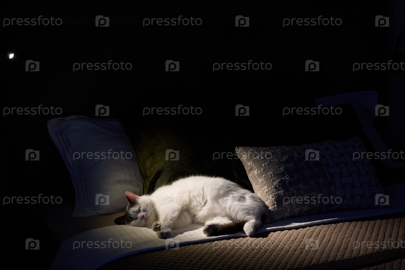 Уютный кот отдыхает в теплых солнечных лучах на удобной кровати, наслаждаясь чистым комфортом