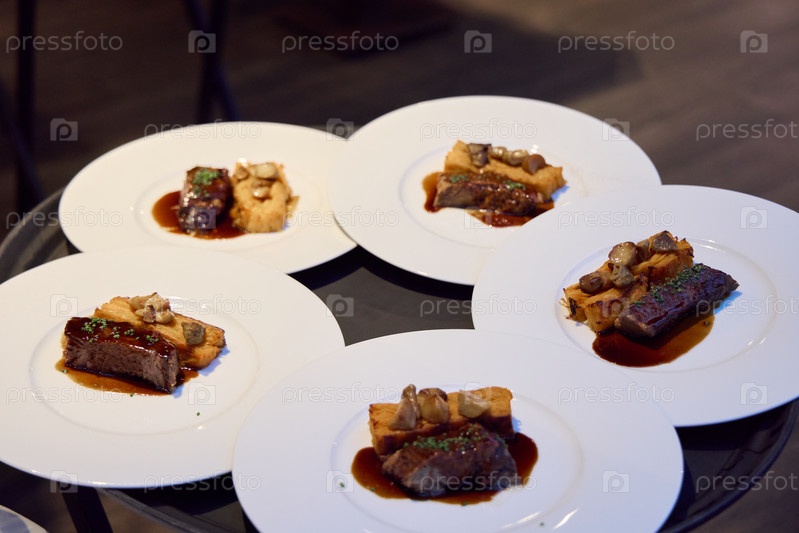Изысканная и красивая подача изысканных блюд на элегантных тарелках и сервировке