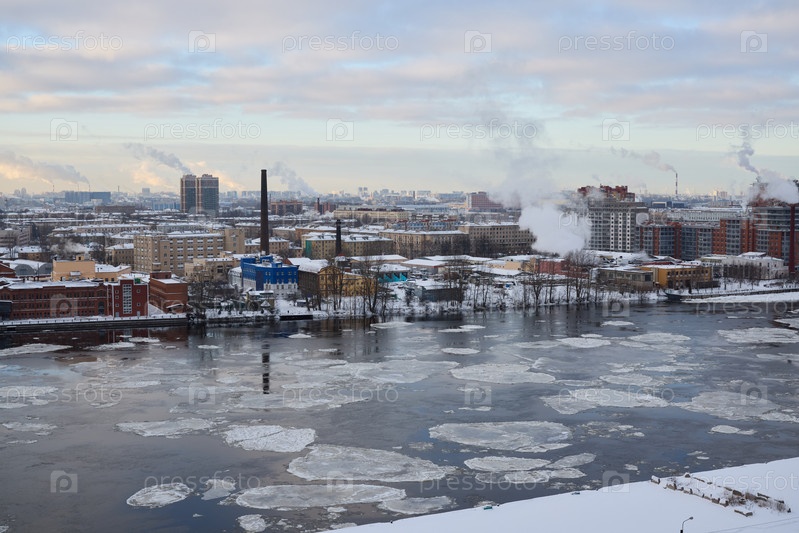 Красивый зимний городской пейзаж с рекой и различными промышленными элементами