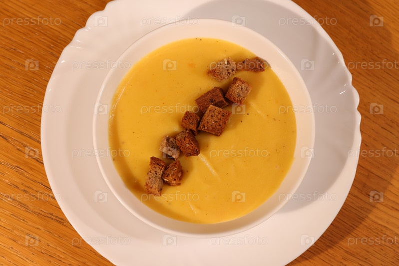 Вкусный кремовый тыквенный суп, подается теплым и красиво украшенным хрустящими гренками