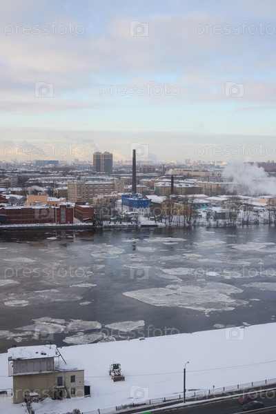 Потрясающий зимний городской пейзаж с замерзшей рекой и впечатляющим промышленным горизонтом