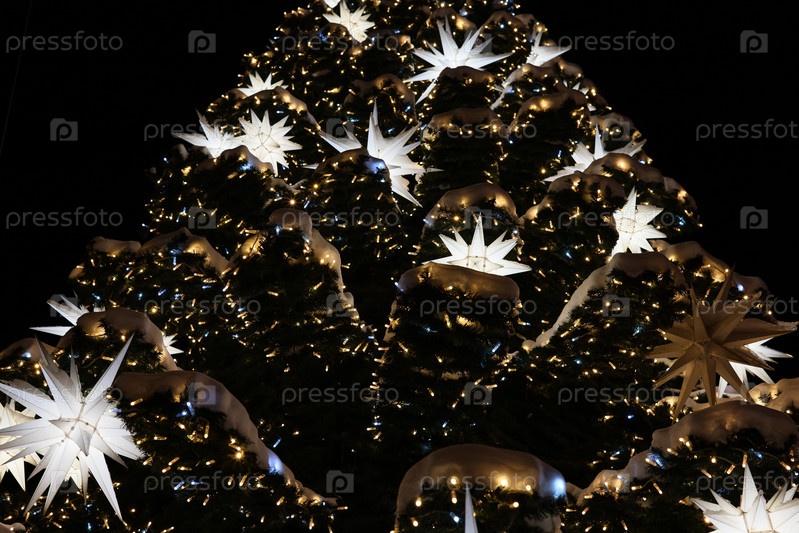 Красивая и праздничная рождественская елка, украшенная светящимися игрушками и сияющими звездами