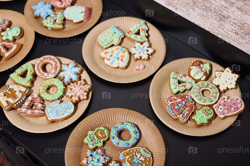 Красиво украшенное праздничное печенье подается на красочных тарелках для наслаждения
