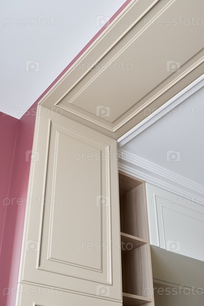 Элегантные и стильные кремовые панели в сочетании с нежно-розовой акцентной стеной создают теплую атмосферу